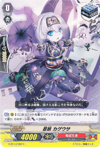 ![]() ![]() | G-BT14/082 忍妖 カゲウサ トリガーユニット Gブースターパック 第14弾 竜神烈伝 C 国家:ドラゴンエンパイア クラン:ぬばたま 種族:ゴースト スキル:ブースト グレード:0 パワー:4000 クリティカル:1 シールド値:10000 トリガー:醒 トリガー修正:+5000 【起】【R】:[このユニットを裏でバインドする]いずれかのリアガードを2枚まで選び、そのターン中、パワー+2000。 目に映るは虚像。溶け入る影こそが本体なのだ。 イラスト:齋藤タヶオ |
