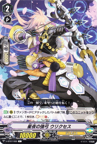 ![]() ![]() | V-BT07/050 星夜の強弓 ウリクセス ノーマルユニット Vブースターパック 第7弾 神羅創星 C 国家:ユナイテッドサンクチュアリ クラン:ジェネシス 種族:ノーブル スキル:インターセプト グレード:2 パワー:10000 クリティカル:1 シールド値:5000 【自】【R】:ヴァンガードにアタックしたバトル終了時、【コスト[このユニットをソウルに置く]】ことで、1枚引き、【ソウル・チャージ①】。 この一射で、希望への路を拓く! イラスト:桂福蔵 |