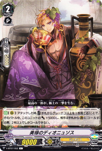 ![]() ![]() | V-BT07/052 美禄のディオニュソス ノーマルユニット Vブースターパック 第7弾 神羅創星 C 国家:ユナイテッドサンクチュアリ クラン:ジェネシス 種族:ノーブル スキル:インターセプト グレード:2 パワー:9000 クリティカル:1 シールド値:5000 【自】【R】:アタックした時、【コスト[手札からグレード3以上を1枚捨てる]】ことで、そのバトル中、このユニットのパワー+5000し、相手は手札から(G)にコールする際、2枚以上でしかコールできない。 最高の一杯が、極上の一撃を生む。 イラスト:モレシャン |