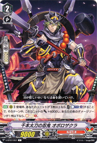 ![]() ![]() | V-BT07/057 千本太刀の忍鬼 オボロザクラ ノーマルユニット Vブースターパック 第7弾 神羅創星 C 国家:ドラゴンエンパイア クラン:ぬばたま 種族:デーモン スキル:インターセプト グレード:2 パワー:9000 クリティカル:1 シールド値:5000 【自】【R】:登場時、あなたのユニットが3枚以上なら、【コスト[【カウンターブラスト①】]】することで、そのターン中、このユニットのパワー+6000し、あなたの表のダメージゾーンが1枚以下なら、【ソウルチャージ①】。 刀が惜しいか。ならば命を置いていけ。 イラスト:touge369 |
