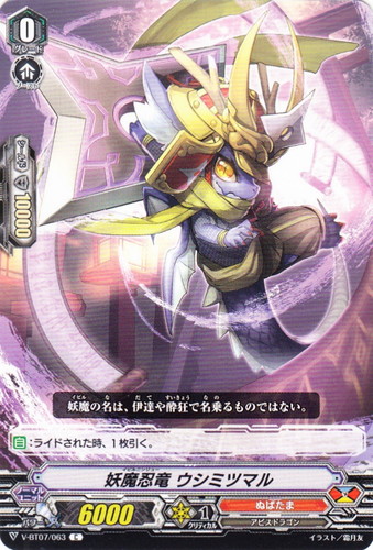 ![]() ![]() | V-BT07/063 妖魔忍竜 ウシミツマル ノーマルユニット Vブースターパック 第7弾 神羅創星 C 国家:ドラゴンエンパイア クラン:ぬばたま 種族:アビスドラゴン スキル:ブースト グレード:0 パワー:6000 クリティカル:1 シールド値:10000 【自】:ライドされた時、1枚引く。 妖魔の名は、伊達や酔狂で名乗るものではない。 イラスト:霜月友 |