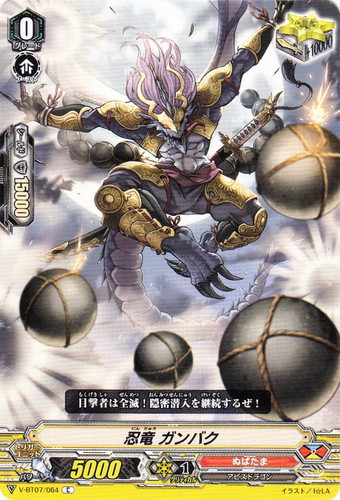 ![]() ![]() | V-BT07/064 忍竜 ガンバク トリガーユニット Vブースターパック 第7弾 神羅創星 C 国家:ドラゴンエンパイア クラン:ぬばたま 種族:アビスドラゴン スキル:ブースト グレード:0 パワー:5000 クリティカル:1 シールド値:15000 トリガー:☆ トリガー修正:+10000 目撃者は全滅!隠密潜入を継続するぜ! イラスト:I☆LA |