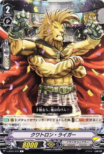 ![]() ![]() | V-BT07/072 クワトロン・ライガー ノーマルユニット Vブースターパック 第7弾 神羅創星 C 国家:スターゲート クラン:ノヴァグラップラー 種族:エイリアン スキル:インターセプト グレード:2 パワー:8000 クリティカル:1 シールド値:5000 【自】【R】:アタックがヴァンガードにヒットした時、【コスト[【ソウルブラスト①】]】することで、1枚引く。 手数なら、俺は負けん! イラスト:山崎太郎 |