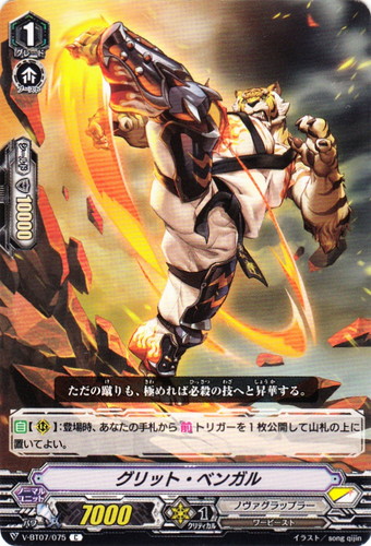 ![]() ![]() | V-BT07/075 グリット・ベンガル ノーマルユニット Vブースターパック 第7弾 神羅創星 C 国家:スターゲート クラン:ノヴァグラップラー 種族:ワービースト スキル:ブースト グレード:1 パワー:7000 クリティカル:1 シールド値:10000 【自】【R】:登場時、あなたの手前から【前】トリガーを1枚公開して山札の上に置いてよい。 ただの蹴りも、極めれば必殺の技へと昇華する。 イラスト:song qijin |