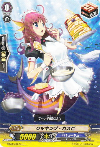 ![]() ![]() | EB02/028 クッキング・カスピ トリガーユニット エクストラブースター 第2弾 歌姫の饗宴 C 国家:メガラニカ クラン:バミューダ△ 種族:マーメイド スキル:ブースト グレード:0 パワー:5000 クリティカル:1 シールド値:5000 トリガー:引 トリガー修正:+5000 てへ。内緒だよ? イラスト:Hirokorin |