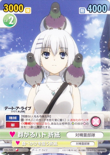 ![]() ![]() | DAL/026 群がるハト 折紙/対精霊部隊 キャラクター ブースターパック デート・ア・ライブ C 作品名:デート・ア・ライブ パートナー:食べかけを狙う折紙/対精霊部隊 Lv:2 攻:3000 防:4000 性別:女性 アイコン:キャンセル 《機械》《軍》【問題ない、私も今来た所】 【キャンセル】【起】[手札][このカードを控え室に置く]→あなたのベンチの《機械》が2枚以上なら、あなたは相手の、【スパーク】の技か【キャンセル】の技を1つ選び、無効化する。 |