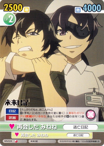 ![]() ![]() | MN/016 手を引く由乃/雪輝日記 キャラクター エクストラブースター 未来日記 C 作品名:未来日記 パートナー:返り血を浴びる由乃/雪輝日記 Lv:1 攻:2000 防:4000 性別:女性 アイコン:キャンセル 《日記》《未来》【あそこまで行けば助かる・・・】 【キャンセル】【起】[手札][このカードを控え室に置く]→あなたのベンチの《未来》が2枚以上なら、あなたは相手の、【スパーク】の技か【キャンセル】の技を1つ選び、無効化する。 |