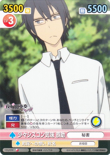 ![]() ![]() | YZQ/007 水着のアオ/サトリ キャラクター トライアルデッキ 夜桜四重奏 -ハナノウタ- TD 作品名:夜桜四重奏 -ハナノウタ- パートナー:敏腕所員 アオ/サトリ Lv:1 攻:2000 防:4000 性別:女性 アイコン:キャンセル 《妖怪》《妹》【ふう・・・】 【キャンセル】【起】[手札][このカードを控え室に置く]→あなたのベンチの『夜桜四重奏 -ハナノウタ-』が2枚以上なら、あなたは相手の、【スパーク】の技か【キャンセル】の技を1つ選び、無効化する。 |
