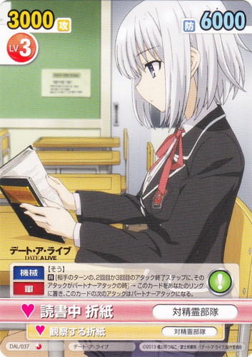 ![]() ![]() | DAL/037 読書中 折紙/対精霊部隊 キャラクター ブースターパック デート・ア・ライブ C 作品名:デート・ア・ライブ パートナー:観察する折紙/対精霊部隊 Lv:3 攻:3000 防:6000 性別:女性 アイコン:サプライズ 《機械》《軍》【そう】 【サプライズ】【自】[相手のターンの、2回目か3回目のアタック終了ステップに、そのアタックがパートナーアタックの時]→このカードをあなたのリングに置き、このカードの次のアタックはパートナーアタックになる。 |