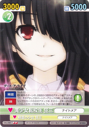 ![]() ![]() | DAL/080 美少女転校生 狂三/ナイトメア キャラクター ブースターパック デート・ア・ライブ U 作品名:デート・ア・ライブ パートナー:精霊の少女 狂三/ナイトメア Lv:2 攻:3000 防:5000 性別:女性 アイコン:サプライズ 《精霊》《時》【んふ♪】 【自】【サプライズ】[相手のターンの、2回目か3回目のアタック終了ステップに、そのアタックがパートナーアタックの時]→あなたのリングのカードの次のアタック中、そのカードを+2500/+0。このカードをあなたの、フィールドか控え室に置く。 |