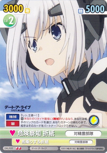 ![]() ![]() | DAL/035 危険察知 折紙/対精霊部隊 キャラクター ブースターパック デート・ア・ライブ U 作品名:デート・ア・ライブ パートナー:馬乗りする折紙/対精霊部隊 Lv:2 攻:3000 防:5000 性別:女性 アイコン:スパーク 《機械》《軍》【しっ、士道ー!】 【自】【スパーク】あなたのリタイヤ置場に《機械》がいるなら、あなたは相手のリングのカードを選び、あなたのターンの終わりまで、相手はそのカードをパートナーブロックできない。 |