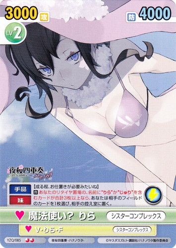 ![]() ![]() | YZQ/086 V・りら・F/シスターコンプレックス キャラクター ブースターパック 夜桜四重奏 -ハナノウタ- SR 作品名:夜桜四重奏 -ハナノウタ- パートナー:魔法使い? りら/シスターコンプレックス Lv:4 攻:3500 防:7500 性別:女性 《手品》《妹》【ハロウ、じゅりお姉様】 【起】[リング][あなたの、「スタンド」か「レスト」のエネルギーを1枚「リバース」する]→この技は、1ターンに1回まで使える。あなたのリタイヤがすべて、名前に“りら”か“じゅり”を含むカードなら、そのターン中、このカードを+1000/+0。 |