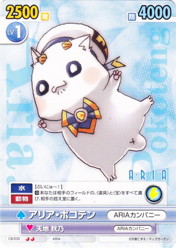 ![]() ![]() | CB/030 アリア・ポコテン/ARIAカンパニー キャラクター ブースターパック コミックブレイド U 作品名:ARIA パートナー:天地 秋乃/ARIAカンパニー Lv:1 攻:2500 防:4000 性別:男性 アイコン:スパーク 《水》《動物》【ぷいにゅ~!】 【スパーク】【自】あなたは相手のフィールドの、《道具》と《宝》をすべて選び、相手の控え室に置く。 |