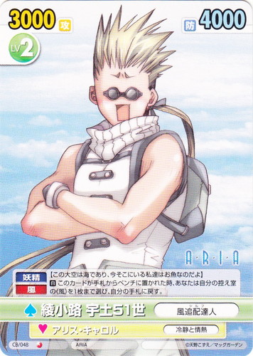 ![]() ![]() | CB/048 綾小路 宇土51世/ キャラクター ブースターパック コミックブレイド C 作品名:ARIA パートナー:アリス・キャロル/冷静と情熱 Lv:2 攻:3000 防:4000 性別:男性 《妖精》《風》【この大空は海であり、今そこにいる私達はお魚なのだよ】 【自】このカードが手札からベンチに置かれた時、あなたは自分の控え室の《風》を1枚まで選び、自分の手札に戻す。 |