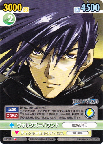 ![]() ![]() | CB/083 ヴォルクス=ハウンド/孤高の狩人 キャラクター ブースターパック コミックブレイド C 作品名:EREMENTAR GERAD-蒼空の戦旗- パートナー:ティクル=セルヴァトロス/俺の道具 Lv:2 攻:3000 防:4500 性別:男性 アイコン:スパーク 《武器》《のりもの》【狩猟の福音は鳴った!!!】 【スパーク】【自】あなたはカード名の名前を1つ宣言する。あなたは相手のエネルギーを見て宣言した名前と同じカードを1枚選び、相手の控え室に置く。(見たエネルギーは元の状態に戻す) |