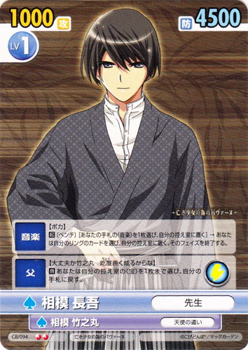 ![]() ![]() | CB/094 相模 長吾/先生 キャラクター ブースターパック コミックブレイド U 作品名:亡き少女の為のパヴァーヌ パートナー:相模 竹之丸/天使の遣い Lv:1 攻:1000 防:4500 性別:男性 アイコン:スパーク 《音楽》【ポカ】 【起】[ベンチ][あなたの手札の《音楽》を1枚選び、自分の控え室に置く]→あなたは自分のリングのカードを選び、自分の控え室に置く。そのフェイズを終了する。 《父》【大丈夫か竹之丸・・・屹度善く成るからな】 【スパーク】【自】あなたは自分の控え室の《宝》を1枚まで選び、自分の手札に戻す。 |