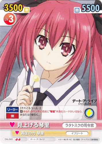 ![]() ![]() | DAL/056 真紅の軍服 琴里/ラタトスクの司令官 キャラクター ブースターパック デート・ア・ライブ C 作品名:デート・ア・ライブ パートナー:驚愕する琴里/士道の可愛い妹 Lv:1 攻:2000 防:1500 性別:女性 アイコン:スパーク/ファイヤー 《リーダー》《黒》【―歓迎するわ。ようこそ、ラタトスクへ】 【スパーク】【自】あなたは相手のフィールドのカードを、自分のリタイヤ置場の「デート・ア・ライブ」のカードと同じ枚数選び、相手の控え室に置く。 |