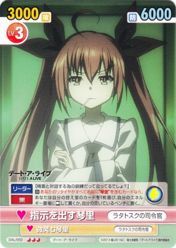 ![]() ![]() | DAL/053 馬鹿にする琴里/ラタトスクの司令官 キャラクター ブースターパック デート・ア・ライブ U 作品名:デート・ア・ライブ パートナー:サンバを踊る琴里/士道の可愛い妹 Lv:2 攻:2500 防:5000 性別:女性 《リーダー》《黒》【―にしてもアホ兄はなんであんなところにいたわけ?】 【自】[ベンチ]このカードが名前に“琴里”を含むカードをサポートした時、このカードをあなたの控え室に置いてよい。1枚以上置いたら、あなたは自分のリングのカードを選び、そのターン中、そのカードを+1000/+0。 |
