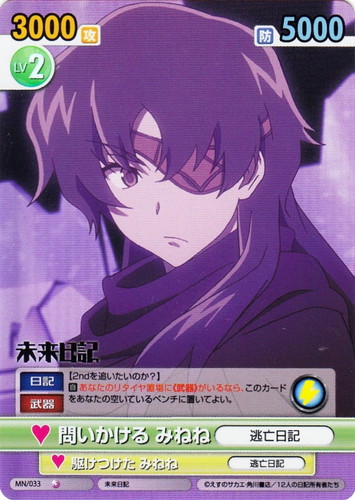 ![]() ![]() | MN/030 3周目の世界 みねね/逃亡日記 キャラクター エクストラブースター 未来日記 C 作品名:未来日記 パートナー:姿を明かした みねね/逃亡日記 Lv:3 攻:3000 防:6000 性別:女性 アイコン:スパーク 《日記》《武器》【ここは3周目の世界ってことだな】 【スパーク】【自】あなたのリタイヤ置場に《武器》がいるなら、あなたのターンの終わりまで、このカードを+1500/+1500。 |