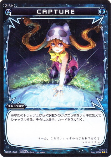 ![]() ![]() | WX19-040 CAPTURE スペル 拡張パック アンソルブドセレクター R 色:青 コスト:[青1] 【エルドラ限定】 あなたのトラッシュから<水獣>のシグニ5枚をデッキに加えてシャッフルする。そうした場合、カードを2枚引く。 うーん、これでいいっすかね?あれ?だめ? ~エルドラ~ illust:DQN |
