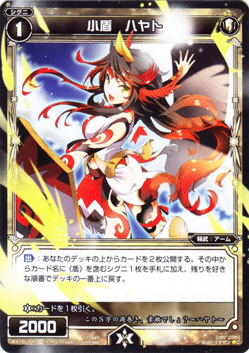 ![]() ![]() | WX19-049 小盾 ハヤト シグニ 拡張パック アンソルブドセレクター C 色:白 タイプ:精武 クラス:アーム レベル:1 パワー:2000 【出】:あなたのデッキの上からカードを2枚公開する。その中からカード名に《盾》を含むシグニ1枚を手札に加え、残りを好きな順番でデッキの一番上に戻す。 【バースト】:カードを1枚引く。 このS字の渦巻き、素敵でしょ?~ハヤト~ illust:イチゼン |