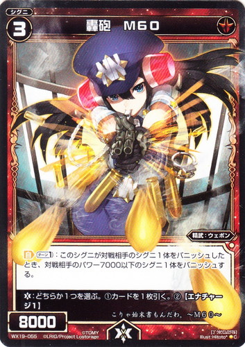 ![]() ![]() | WX19-055 轟砲 M60 シグニ 拡張パック アンソルブドセレクター C 色:赤 タイプ:精武 クラス:ウェポン レベル:3 パワー:8000 【自】【ターン1】:このシグニが対戦相手のシグニ1体をバニッシュしたとき、対戦相手のパワー7000以下のシグニ1体をバニッシュする。 【バースト】:どちらか1つを選ぶ。①カードを1枚引く。②【エナチャージ1】 こりゃ始末書もんだわ。~M60~ illust:Hitoto* |