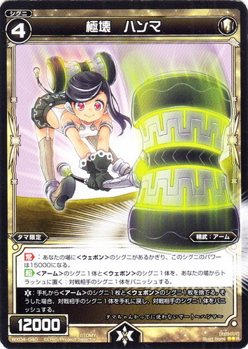 ![]() ![]() | WX04-040 極壊 ハンマ シグニ 拡張パック インフェクテッドセレクター R 色:白 タイプ:精武 クラス:アーム レベル:4 パワー:12000 【タマ限定】 【常】:あなたの場に<ウェポン>のシグニがあるかぎり、このシグニのパワーは15000になる。 【起】<アーム>のシグニ1体と<ウェポン>のシグニ1体を、あなたの場からトラッシュに置く:対戦相手のシグニ1体をバニッシュする。 【バースト】:手札から<アーム>のシグニ1枚と<ウェポン>のシグニ1枚を捨てる。そうした場合、対戦相手のシグニ1体を手札に戻し、対戦相手のシグニ1体をバニッシュする。 タマちゃんかってに使わないでー!~ハンマ~ illust:bomi |