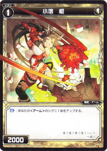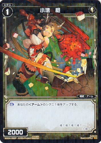 ![]() ![]() | WX04-062P 小壊 棍 シグニ 拡張パック インフェクテッドセレクター C(foil) 色:白 タイプ:精武 クラス:アーム レベル:1 パワー:2000 【出】:あなたの<アーム>のシグニ1体をアップする。 壊!壊!壊!壊!へい! ~壊~ illust:トリダモノ |
