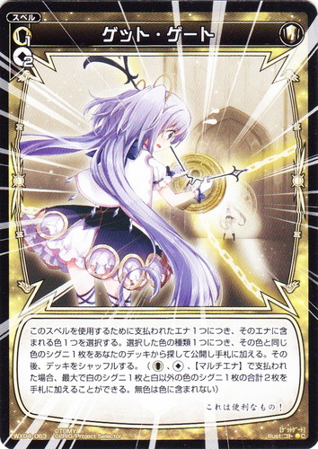 ![]() ![]() | WX04-063 ゲット・ゲート スペル 拡張パック インフェクテッドセレクター C 色:白 コスト:[白1][無2] このスペルを使用するために支払われたエナ1つにつき、そのエナに含まれる色1つを選択する。選択した色の種類1つにつき、その色と同じ色のシグニ1枚をあなたのデッキから探して公開し手札に加える。その後、デッキをシャッフルする。([白]、[無]、【マルチエナ】で支払われた場合、最大で白のシグニ1枚と白以外の色のシグニ1枚の合計2枚を手札に加えることができる。無色は色に含まれない) これは便利なもの! illust:コト |