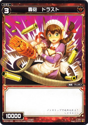 ![]() ![]() | WX04-065 轟砲 ドラスト シグニ 拡張パック インフェクテッドセレクター C 色:赤 タイプ:精武 クラス:ウェポン レベル:3 パワー:10000 ノンストップで攻め込むよ! ~ドラスト~ illust:コウサク |