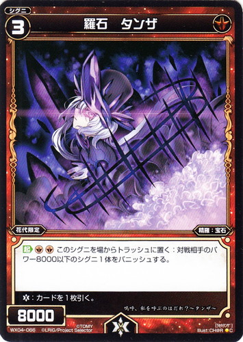 ![]() ![]() | WX04-066 羅石 タンザ シグニ 拡張パック インフェクテッドセレクター C 色:赤 タイプ:精羅 クラス:宝石 レベル:3 パワー:8000 【花代限定】 【起】[赤2]このシグニを場からトラッシュに置く:対戦相手のパワー8000以下のシグニ1体をバニッシュする。 【バースト】:カードを1枚引く。 嗚呼、私を呼ぶのはだれ?~タンザ~ illust:CH@R |