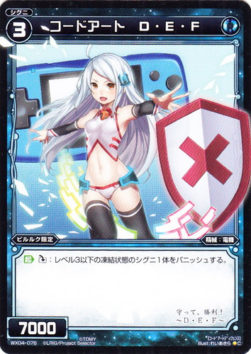 ![]() ![]() | WX04-076 コードアート D・E・F シグニ 拡張パック インフェクテッドセレクター C 色:青 タイプ:精械 クラス:電機 レベル:3 パワー:7000 【ピルルク限定】 【起】[ダウン]:レベル3以下の凍結状態のシグニ1体をバニッシュする。 守って、勝利! ~D・E・F~ illust:れいあきら |