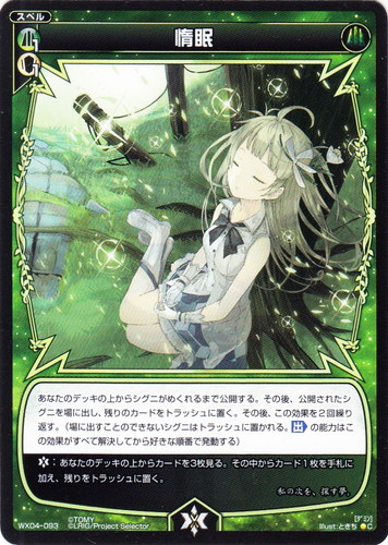 ![]() ![]() | WX04-093 惰眠 スペル 拡張パック インフェクテッドセレクター C 色:緑 コスト:[緑1][白1] あなたのデッキの上からシグニがめくれるまで公開する。その後、公開されたシグニを場に出し、残りのカードをトラッシュに置く。その後、この効果を2回繰り返す。(場に出すことのできないシグニはトラッシュに置かれる。【出】の能力はこの効果がすべて解決してから好きな順番で発動する) 【バースト】:あなたのデッキの上からカードを3枚見る。その中からカード1枚を手札に加え、残りをトラッシュに置く。 私の次を、探す夢。 illust:ときち |