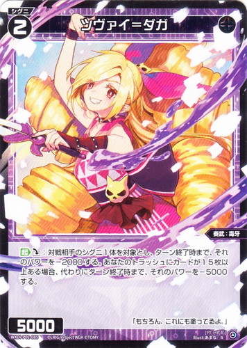 ![]() ![]() | WXDi-P01-085 ツヴァイ=ダガ シグニ 拡張パック GLOWING DIVA R 色:黒 タイプ:奏武 クラス:毒牙 フォーマット:ディーヴァ レベル:2 パワー:5000 【起】ダウン:対戦相手のシグニ1体を対象とし、ターン終了時まで、それのパワーを-2000する。あなたのトラッシュにカードが15枚以上ある場合、代わりにターン終了時まで、それのパワーを-5000する。 「もちろん、これにも塗ってるよ。」 illust:あまな |