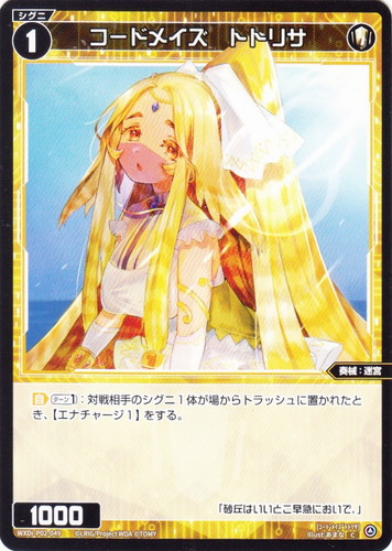 ![]() ![]() | WXDi-P02-049 コードメイズ トトリサ シグニ 拡張パック CHANGING DIVA C 色:白 タイプ:奏械 クラス:迷宮 フォーマット:ディーヴァ レベル:1 パワー:1000 【自】【ターン1】:対戦相手のシグニ1体が場からトラッシュに置かれたとき、【エナチャージ1】をする。 「砂丘はいいとこ早急においで。」 illust:あまな |