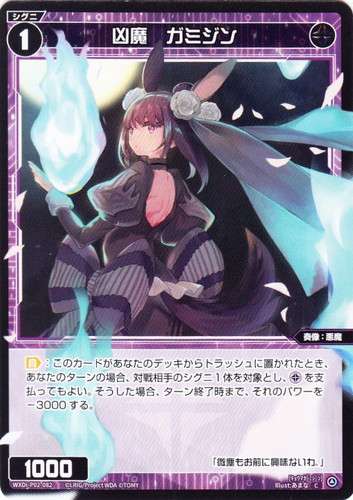 ![]() ![]() | WXDi-P02-082 凶魔 ガミジン シグニ 拡張パック CHANGING DIVA C 色:黒 タイプ:奏像 クラス:悪魔 フォーマット:ディーヴァ レベル:1 パワー:1000 【自】:このカードがあなたのデッキからトラッシュに置かれたとき、あなたのターンの場合、対戦相手のシグニ1体を対象とし、[黒1]を支払ってもよい。そうした場合、ターン終了時まで、それのパワーを-3000する。 「微塵もお前に興味ないわ。」 illust:あまな |