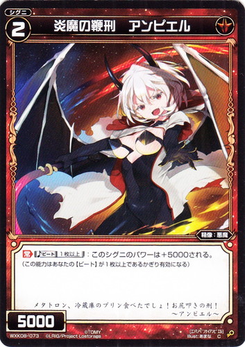 ![]() ![]() | WXK08-073 炎魔の鞭刑 アンピエル シグニ 拡張パック アンリアリスティック C 色:赤 タイプ:精像 クラス:悪魔 フォーマット:キー レベル:2 パワー:5000 【起】【ビート:1枚以下】:このシグニのパワーは+5000される。 (この能力はあなたの【ビート】が1枚以下であるかぎり有効になる) メタトロン、冷蔵庫のプリン食べたでしょ!お尻叩きの刑! ~アンビエル~ illust:あまな |
