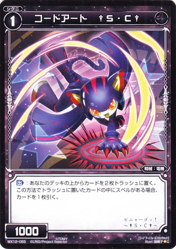 ![]() ![]() | WX12-055 コードアート †S・C† シグニ 拡張パック リプライドセレクター C 色:黒 タイプ:精械 クラス:電機 レベル:1 パワー:1000 【出】:あなたのデッキの上からカードを2枚トラッシュに置く。この方法でトラッシュに置いたカードの中にスペルがある場合、カードを1枚引く。 ビニャーゴ! ~†S・C†~ illust:猫囃子 |