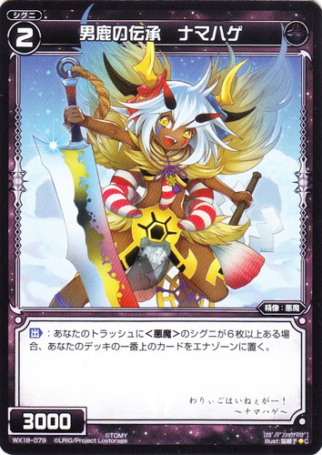![]() ![]() | WX18-079 男鹿の伝承 ナマハゲ シグニ 拡張パック コンフレーテッド セレクター C 色:黒 タイプ:精像 クラス:悪魔 レベル:2 パワー:3000 【出】:あなたのトラッシュに<悪魔>のシグニが6枚以上ある場合、あなたのデッキの一番上のカードをエナゾーンに置く。 わりぃごはいねぇがー! ~ナマハゲ~ illust:猫囃子 |