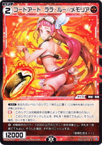 ![]() ![]() | WXDi-P06-054 コードアート ロンドウバ シグニ 拡張パック WELCOME BACK DIVA ~selector~ C 色:赤 タイプ:奏械 クラス:電機 フォーマット:ディーヴァ レベル:1 パワー:2000 【自】:このシグニが《コードアート ララ・ルー//メモリア》にライズされたとき、対戦相手のパワー5000以下のシグニ1体を対象とし、[無1]を支払ってもよい。そうした場合、それをバニッシュする。 【常】:このカードの上にある赤のシグニは「【自】:このシグニがバニッシュされたとき、このシグニをエナゾーンから手札に加えてもよい。」を得る。 「疾風怒蕩!一発アウトだな。」 illust:単ル |