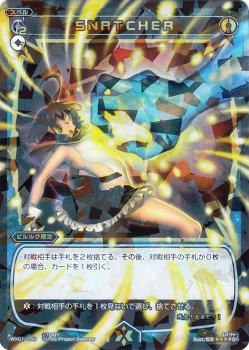![]() ![]() | WX01-032 SNATCHER スペル 拡張パック サーブドセレクター SR 色:青 グロウコスト:[青2][無1] 【ピルルク限定】 対戦相手は手札を2枚捨てる。その後、対戦相手の手札が0枚の場合、カードを1枚引く。 【バースト】:対戦相手の手札を1枚見ないで選び、捨てさせる。 残念!大当たり! illust:煎茶 |