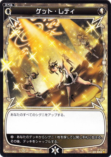 ![]() ![]() | WX01-063 ゲット・レディ スペル 拡張パック サーブドセレクター C 色:白 コスト:[白1] あなたのすべてのシグニをアップする。 【バースト】:あなたのデッキからシグニ1枚を探して公開し手札に加える。その後、デッキをシャッフルする。 illust:由利 真珠郎 |