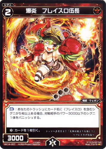 ![]() ![]() | WX14-057 爆炎 フレイスロ伍長 シグニ 拡張パック サクシードセレクター C 色:赤 タイプ:精武 クラス:ウェポン レベル:2 パワー:3000 【出】:あなたのトラッシュにカード名に《フレイスロ》を含むシグニが5枚以上ある場合、対戦相手のパワー3000以下のシグニ1体をバニッシュする。 【バースト】:カードを1枚引く。 ンッン~♪名言よ!「炎拳は銃よりも強し!」 ~フレイスロ伍長~ illust:アカバネ |