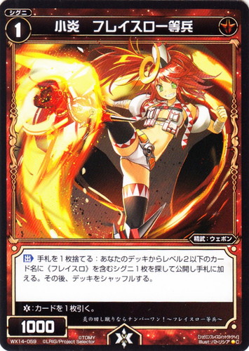 ![]() ![]() | WX14-059 小炎 フレイスロ一等兵 シグニ 拡張パック サクシードセレクター C 色:赤 タイプ:精武 クラス:ウェポン レベル:1 パワー:1000 【出】手札を1枚捨てる:あなたのデッキからレベル2以下のカード名に《フレイスロ》を含むシグニ1枚を探して公開し手札に加える。その後、デッキをシャッフルする。 【バースト】:カードを1枚引く。 炎の回し蹴りならナンバーワン!~フレイスロ一等兵~ illust:パトリシア |