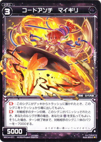 ![]() ![]() | WX14-071 コードアンチ マイギリ シグニ 拡張パック サクシードセレクター C 色:黒 タイプ:精械 クラス:古代兵器 レベル:3 パワー:5000 【常】:このシグニがデッキからトラッシュに置かれたとき、このシグニをトラッシュから場に出してもよい。 【常】:対戦相手のターンの間、このシグニがバニッシュされたとき、あなたのルリグが黒の場合、あなたは[黒1]を支払ってもよい。そうした場合、ターン終了時まで、対戦相手のシグニ1体のパワーを-7000する。 キリギリ舞い舞ーい!~マイギリ~ illust:茶ちえ |