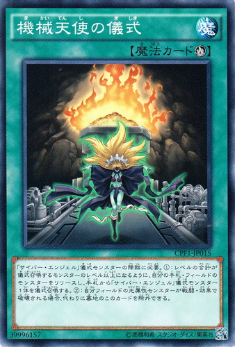 ![]() ![]() | CPF1-JP015 機械天使の儀式 魔法 コレクターズパック―閃光の決闘者編― ノーマル 分類:儀式 「サイバー・エンジェル」儀式モンスターの降臨に必要。 ①:レベルの合計が儀式召喚するモンスターのレベル以上になるように、自分の手札・フィールドのモンスターをリリースし、手札から「サイバー・エンジェル」儀式モンスター1体を儀式召喚する。 ②:自分フィールドの光属性モンスターが戦闘・効果で破壊される場合、代わりに墓地のこのカードを除外できる。 |