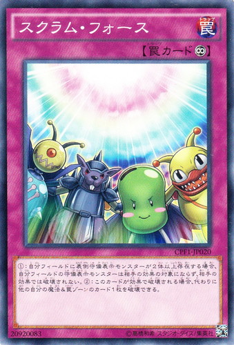![]() ![]() | CPF1-JP020 スクラム・フォース 罠 コレクターズパック―閃光の決闘者編― ノーマル 分類:永続 ①:自分フィールドの表側守備表示モンスターが2体以上存在する場合、自分フィールドの守備表示モンスターは相手の効果の対象にならず、相手の効果では破壊されない。 ②:このカードが効果で破壊される場合、代わりに他の自分の魔法&罠ゾーンのカード1枚を破壊できる。 |