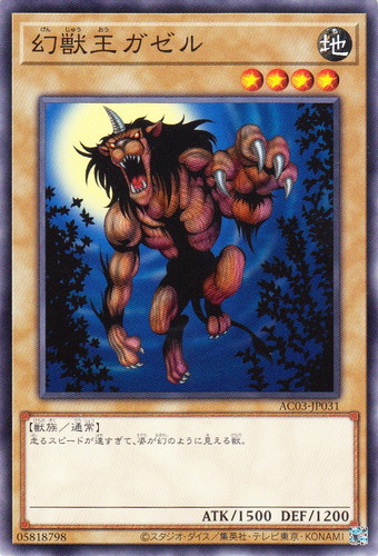 ![]() ![]() | AC03-JP031 幻獣王ガゼル モンスター ANIMATION CHRONICLE 2023 ノーマル 属性:地 分類:通常 種族:獣族 レベル:4 攻撃力:1500 守備力:1200 走るスピードが速すぎて、姿が幻のように見える獣。 |