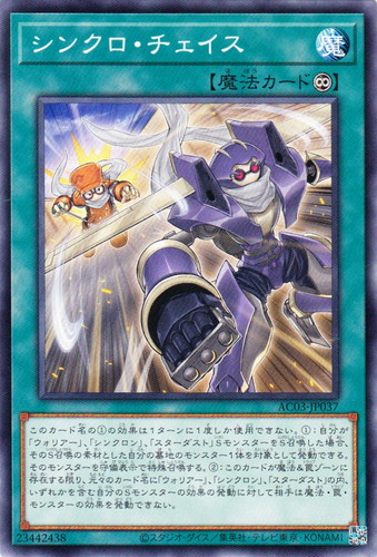 ![]() ![]() | AC03-JP037 シンクロ・チェイス 魔法 ANIMATION CHRONICLE 2023 ノーマル 分類:永続 このカード名の①の効果は1ターンに1度しか使用できない。 ①:自分が「ウォリアー」、「シンクロン」、「スターダスト」SモンスターをS召喚した場合、そのS召喚の素材とした自分の墓地のモンスター1体を対象として発動できる。そのモンスターを守備表示で特殊召喚する。 ②:このカードが魔法&罠ゾーンに存在する限り、元々のカード名に「ウォリアー」、「シンクロン」、「スターダスト」の内、いずれかを含む自分のSモンスターの効果の発動に対して相手は魔法・罠・モンスターの効果を発動できない。 |