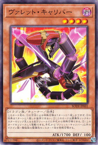 ![]() ![]() | BODE-JP001 ヴァレット・キャリバー モンスター BURST OF DESTINY ノーマル 属性:闇 分類:チューナー/効果 種族:ドラゴン族 レベル:4 攻撃力:1700 守備力:100 このカード名の、①の方法による特殊召喚は1ターンに1度しかできず、②の効果は1ターンに1度しか使用できない。 ①:このカードは闇属性リンクモンスターのリンク先となる自分フィールドに手札から特殊召喚できる。 ②:このカードをリリースして発動できる。手札から「ヴァレット・キャリバー」以外のドラゴン族・機械族の闇属性モンスター1体を特殊召喚する。 |